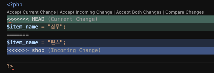 아래와 같이 VS CODE 에서는 충돌된 것을 안내해주고 선택할 수 있는 메뉴를 보여준다.